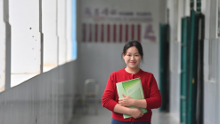 ??蒙秋艷在廣西大化瑤族自治縣板升鄉初級中學的教室外(2025年5月27日攝)。??13年前,在廣西河池市大化瑤族自治縣板升鄉弄雷村哈寶屯,11歲女孩蒙秋艷每日護送低年級弟弟妹妹穿越300